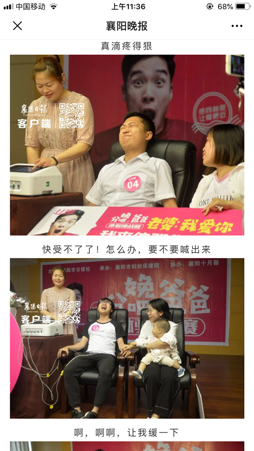 為(wèi)家庭和睦,强化母乳喂养意识提供动力,提高母乳喂养,在5月份,襄阳日报社联手我院举办“分(fēn)娩吧,爸爸”趣味活动。希望通过此次的活动,让父亲體(tǐ)会母亲的痛,才会在家庭里有(yǒu)更多(duō)的担当包容,有(yǒu)利于家庭和睦,促进母乳喂养.(桂琳琳)